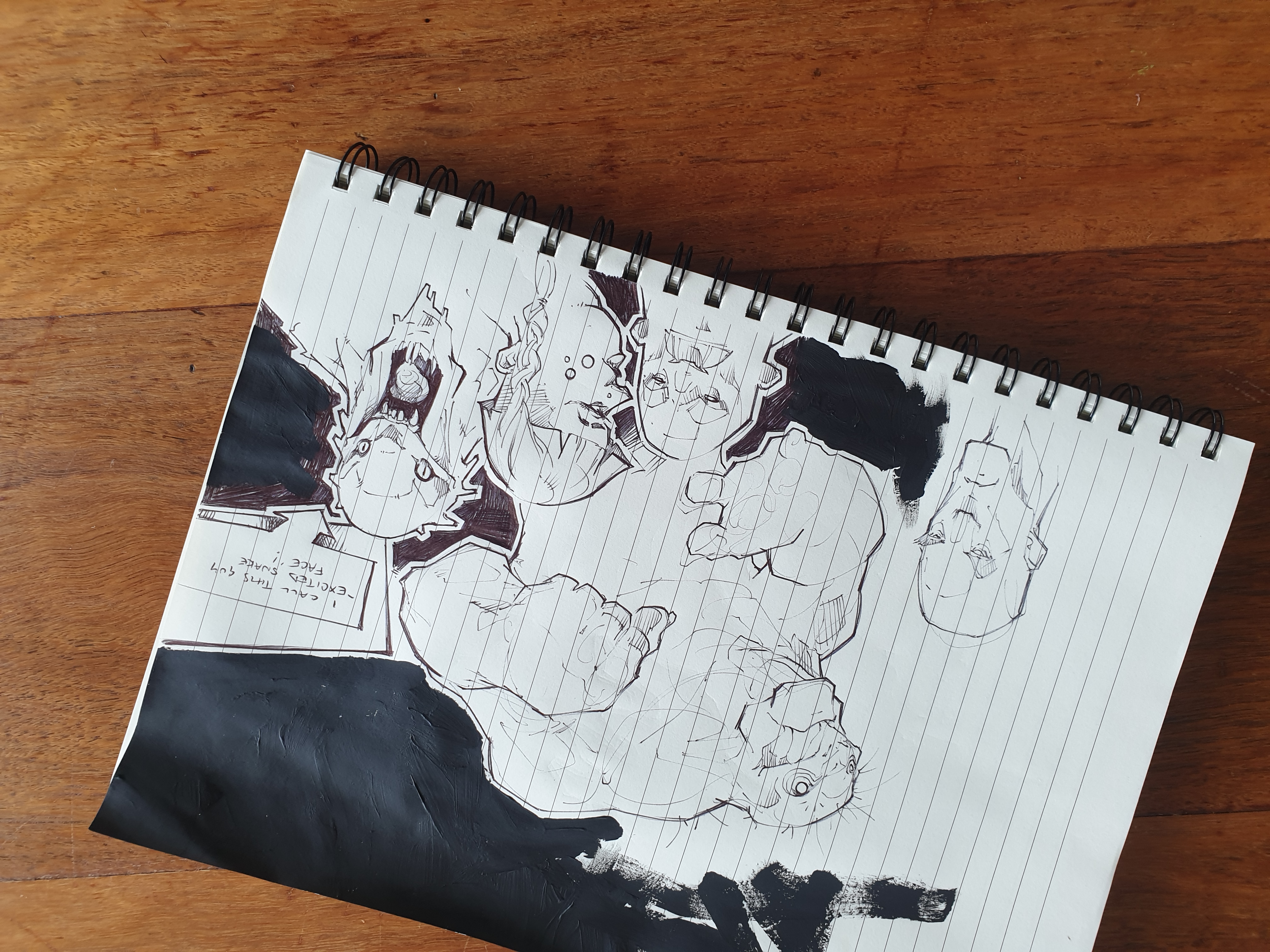 My preferred sketchbook is an A4 Derwent spiral bound (I think they’re 115gsm pages?). But I have used cheaper ones, Karst stone paper ones, smaller ones, Moleskins and loose paper in a pinch. The bulk of my sketching (life drawing included) I do in ballpoint pen. Normally black, but sometimes red or blue. I prefer pen firstly as it doesn’t rub on to the opposing page but also for the forced commitment. There is a range of line weight you can wrangle with ballpoint (depending on the pen quality) but there is no erasing. So it forces a confidence and adaptability that makes mistakes into discoveries.